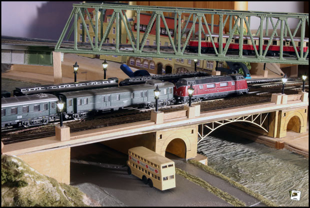 Daher stellt die Beleuchtung der Fernbahnbrücke für mich eine größere Herausforderung dar. Laut der Zeichnung im Buch „Anhalter Bahnhof“ stehen seitlich der Gleise nämlich niedrige Laternen auf Steinsockeln – im Modell müssten sie 17 bis 19 mm hoch sein. So etwas gibt es im ganzen Zubehörhandel nicht. Also wähle ich Spur-Z-Lampen von Viessmann. Mit über 11 € pro Stück kommen allein auf der Brücke schon 133 € für Beleuchtung zusammen. Bei aller Liebe – das ist heftig. Doch selbst diese „Millionärs-Laternen“ sind noch zu hoch. Um halbwegs ans Original zu kommen, muss ich sie tief in den Steinsockeln versenken. Pfusch, sagt mein Gewissen – und recht hat es.