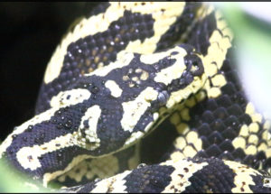 Obwohl der Bereich, den wir nun betreten, „Giftschlangen“ heißt, treffen wir als Erstes auf einen Dschungel-Teppichpython. Diese Würgeschlange mit der kräftigen, schwarz-gelben Zeichnung kann bis zu 2 m lang werden und lebt hauptsächlich in den dichten Regenwäldern des nord-östlichen Teils von Queensland (Nord-Ost-Australien). Sie sind in der Lage, ihre Kiefer auszurenken, sodass sie auch größere Beute verschlingen können, aber giftig ist sie nicht.