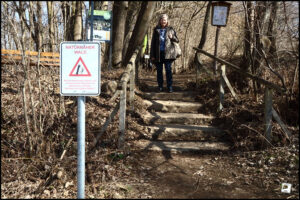 Das Wetter ist prächtig und die Stimmung ebenso. Nach einer kurzen Rast geht’s weiter – immer noch mächtig den Berg hoch. Nach weiteren 350 Metern ist rechter Hand ein Behinderten-Parkplatz, wo – wie soll’s auch anders sein – ein Auto steht, aus dem fünf augenscheinlich – zumindest körperlich – nicht behinderte „Kaffeekränzchen-Krähen“ aussteigen. Die lassen wir jetzt erst mal vor, denn der Märzenbecherwald ist jetzt genau links von uns und deren Geschnatter müssen wir uns nicht antun.