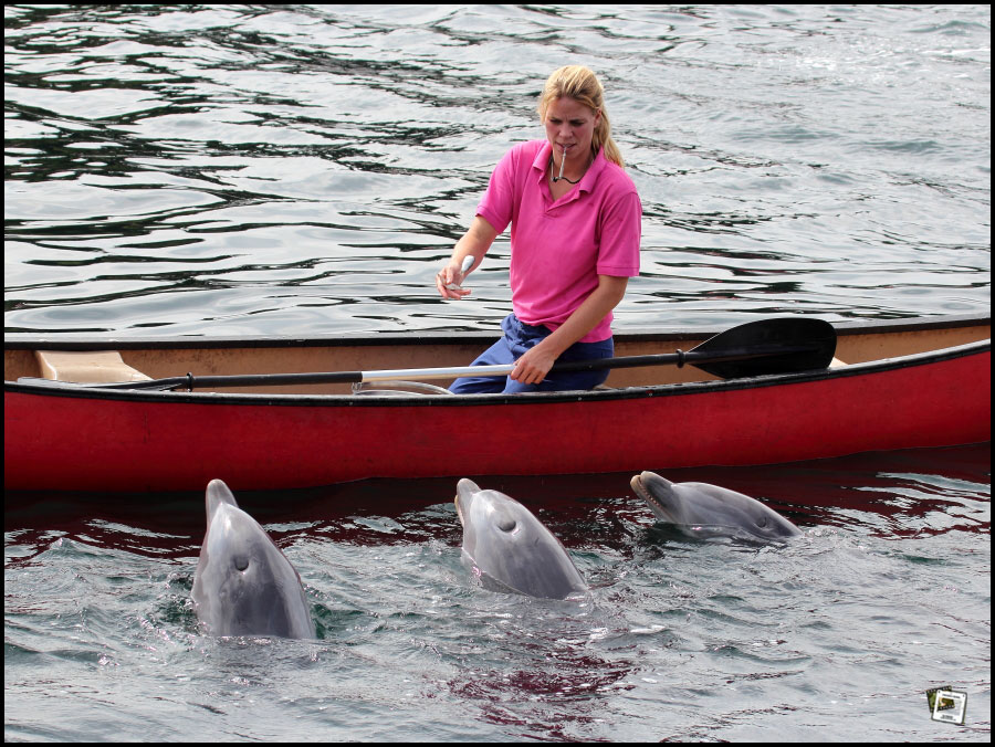 14:00 Uhr. Zwei männliche und zwei weibliche Betreuer kommen aus einem Nebengebäude ins Areal. Die Show beginnt. Zunächst erzählt eine der Frauen etwa 5 Minuten lang (die Delfine sind in der Zeit noch sich selbst überlassen) etwas auf Holländisch, was ich aber leider nicht verstehe. Dann rudern die Betreuer mit Kanus in die Lagune und die Delfine zeigen, wie man es auch aus anderen Delfinarien gewohnt ist, ihre Kunststücke und Sprünge. Schön dabei: Keines der Tiere wird dabei zum „Affen“ gemacht, und es gibt auch keine laute Musik.