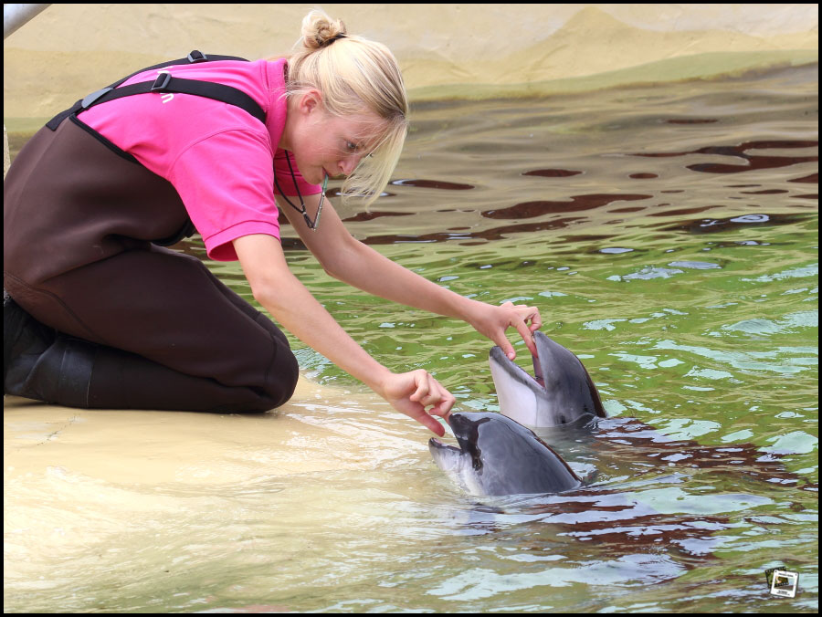 Nach der Show erklären die überaus freundlichen Betreuer in Privatgesprächen am Rande der Lagune jede, aber auch wirklich jede Frage. So erfahre ich, dass der Delfin, welcher Süßwasser bekam, die 45-jährige Skinny sei. Weiter erfahre ich, dass Delfinweibchen Maaike hier am 6. Juli 2013 einer Tochter Baya das Leben schenkte. Die Nürnbergerin Nynke stand Maaike aber in nichts nach und brachte am 9. August 2013, also heute vor 8 Tagen Tochter Zoë zur Welt. Zoë ist damit der 26. Große Tümmler, der seit 1997 in Harderwijk geboren wurde. Wenn das kein Erfolg ist!
