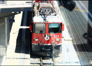 Auf Gleis 13 steht auch schon einer der Züge, bespannt mit einer Lok des Typs Ge 4/4II und der Betriebsnummer 623. Ob das nun der Glacier-Express, der Bernina-Express oder ein ganz anderer Zug ist, kann ich von hier oben nicht sehen. Was man aber sofort erkennt, ist der mit 1000 mm gegenüber 1435 mm deutlich geringere Gleisabstand der Rhätischen Bahn,