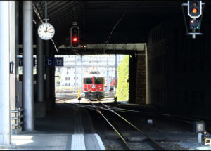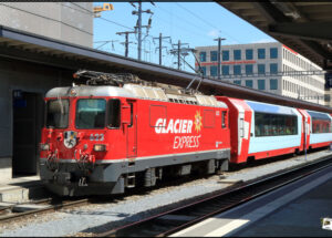 Über eine Rolltreppe am Nordende des Busbahnhofs fahren wir hinunter zum Bahnsteig. Die Ge 4/4II zieht tatsächlich den berühmten Glacier Express. Dieser Zug rühmt sich damit, der „langsamste Schnellzug der Welt“ zu sein. In rund 8 Stunden fährt er von Zermatt kommend nahe der Rhein-Quelle über den 2033 m hohen Oberalp-Pass und weiter nach Chur, wo sich die Strecke gabelt und entweder weiterführt nach St. Moritz oder Davos. Auf der 291 km langen Strecke fährt er durch 91 Tunnel und über 291 Brücken. (Ich hab mich nicht vertippt, es ist tatsächlich so, dass im Schnitt auf jedem Kilometer mindestens eine Brücke ist und alle 3 Kilometer ein Tunnel).