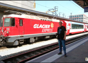 - Rüdiger posiert vor dem Glacier-Express (Foto: Susanne Gugeler)