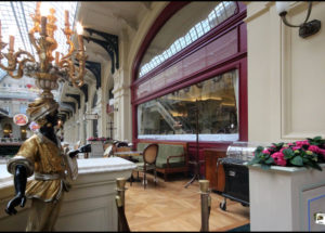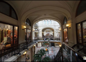 Das Государственный универсальный магазин ГУМ (das Staatliche Universal-Magazin GUM) befindet sich, wenn man vom Auferstehungstor her kommt, am Roten Platz links. Zur Eröffnung 1893 war es der größte und modernste Konsumtempel der Welt. Hier konnte man wundervoll flanieren, denn das Kaufhaus war überdacht und damit auch im Winter wettergeschützt und angenehm warm. Ebenfalls neu waren damals die Preisschilder, sodass ein Handeln entfiel. (Heute gibt es dort vielfach keine Preisschilder mehr. Der normale Besucher würde dort auch schlichtweg seinen Augen nicht mehr trauen.)