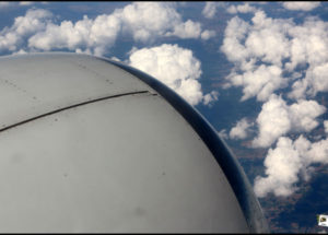 Der Flieger ist relativ klein. Er hat nur 20 Reihen à sechs Plätzen. Wir sitzen in der Reihe acht auf den Plätzen A bis C, in Flugrichtung also links. Draußen ist ein Wechsel zwischen mal dichtester Bewölkung und dann wieder aufgerissener Bewölkung. Der Flug ist langweilig. Es gibt weder einen Film noch eine Positionsanzeige noch was zu essen. Dafür gibt es Wasser umsonst.