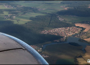 Um 16:50 Uhr sieht man einen keinen Flughafen. Wir machen eine kräftige Linkskurve, man sieht eine Kirche mit goldenen Kuppeln, eine sechs- oder mehrspurige Autobahn und Hochhäuser. Kurz vor der Landung sieht man ein Flugzeug-Denkmal.
