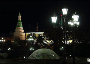 Wir fahren einmal um den Kreml herum und halten auf einem großen gepflasterten Platz südlich der Basilius-Kathedrale. Alexej kennt da nichts. Er macht einfach die Warnblinker an und dann hat er offenbar Parkrecht. Uns kann das nur recht sein. Bei Nacht sieht die Basilius-Kathedrale auch nicht uninteressant aus und jetzt kann ich – als Lehrer – auch gleich nachfragen, ob ihr den Bericht von heute früh auch aufmerksam gelesen habt. Welche Kathedrale ist im Bild vorne zu sehen? Richtig! Es ist die westliche Kirche, die Kirche des Einzugs in Jerusalem, was man an den schraubenlinienförmig nach links oben verlaufenden roten und grünen Quadraten unschwer erkennt.
