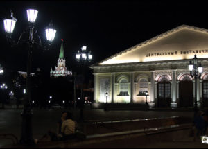 In der Ул. Моховая (Mokhovaya Straße) ein weiterer Stopp. Blickt man nach Süden, schaut man direkt auf die Fassade der Манеж (Manege). Anfang des 19. Jahrhunderts war die Manege eine Paradehalle der russischen Offiziersreitschule. Seit 1957 ist sie eine der größten Hallen Moskaus für Ausstellungen und Kunstmessen. Am 14. März 2004 ist die Manege abgebrannt. Welch ein Zufall, dass der Brand ausgerechnet am Abend Präsidentschaftswahlen ausbrach. Ein Jahr später, wurde sie nach einer umfassenden Rekonstruktion aber wieder eröffnet.