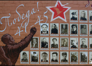 Nach rund einen Kilometer überqueren wir die große Гаршина ул. (Garshina Straße) und sind noch immer nicht da. In Höhe des Lebensmittelmarkts Magnet wird an einer Tafel (mit Portraitfotos) an die Teilnehmer des zweiten Weltkriegs erinnert. Etliche davon sind Verwandte von Alёna und Olga. Das macht betroffen, vor allem, weil die Kriegsteilnehmer plötzlich ein Gesicht haben.