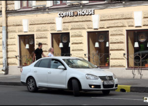Alёna erfährt, dass unser „Uber“ ein weißer VW mit der Nummer 105 im Kennzeichen sei. Er stünde ganz vorne in der Гончарная ул. (Goncharnaya ul.).