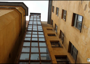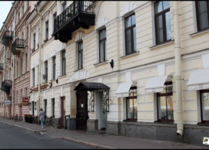 Über ein schmiedeeisernes Tor, an dem wir einen vorher vereinbarten Code eingeben müssen, geht’s zunächst in einen Hinterhof und dort durch eine Seitentür in diesen Aufzug. Einmal (bei der Ankunft) bin ich mitgefahren, dann nie mehr wieder. Wir haben später vorgezogen, die 105 Stufen in den fünften Stock (Erdgeschoss ist in Russland der erste Stock) zu Fuß zu gehen.
