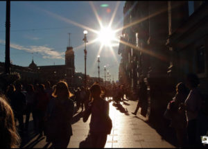 Wohl genährt, können wir zu neuen Taten schreiten – denken wir. Als wir den Prospect Richtung Westen gehen, steht die Sonne so tief, dass man absolut überhaupt nichts mehr sieht. Man tastet sich nur durch ein Menschengewühl.