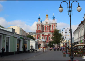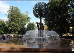 An der St. Klemens Kirche kommen uns Alёna und Simon schon entgegen. Heute haben wir vor, zuerst mal zum Roten Platz zu gehen, von hier aus sind das zu Fuß etwa 20 bis 25 Minuten. Aber nicht, wenn wir an jeder Ecke stehen bleiben. Und das tun wir, denn bereits nach drei Minuten gibt es für uns ein Fotomotiv direkt bei der Metro-Station Новокузнецкая (Nowokusnezkaya): den Adam-und-Eva-Brunnen. Die Bildhauerinnen Marina und Marija Lewinskaja (Mutter und Tochter) haben ihn 2007 zum 860. Jahrestag von Moskau fertiggestellt und im April 2008 der Öffentlichkeit übergeben. Gleich neben dem Brunnen gibt es ein übermannsgroßes Blumenherz, in dessen Mitte sich Jungverliebte gerne ablichten lassen.