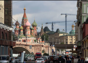 Wir gehen weiter Richtung Norden und überqueren nach etwa 500 Metern einen schmalen Seitenarm der Москва (Moskwa). In der Улица Балчуг (Ulitsa Balchug) sehen wir dann zum ersten Mal die bunten Zwiebeltürme der Собор Василия Блаженного (Basilius-Kathedrale), dem Wahrzeichen Moskaus schlechthin, zwischen Häuserfronten und Baukränen hervorblitzen. Mehr zu der Kirche aber dann, wenn wir näher dran sind. So – in all dem Wirrwarr – kann man ja noch keinen Blumentopf gewinnen.