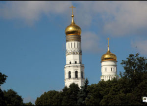 Vom Ende der Brücke aus sieht man linker Hand den 81 Meter hohen Колокольня Ивана Великого (Glockenturm Iwan der Große) und dahinter einen etwas kleineren Turm des Uspenski-Glockengestühls. Hinweis: Iwan der Große (1440 –1505) ist nicht Iwan der Schreckliche (1530 – 1584)!