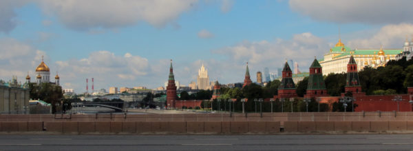 Wir überqueren die Большой Москворецкий Мост (die große Moskwa Brücke). Wenn man dort nach links, also nach Westen blickt, stockt einem der Atem: Hier tut sich eine traumhafte Kulisse auf: Ganz links die Храм Христа́ Спаси́теля (Christ-Erlöser-Kathedrale), rechts daneben die zwei rot-weiß markierten Türme des Kraftwerks am Berezhkovskaya-Damm, in Bildmitte eine der sieben „Zuckerbäckerbauten“ Stalins, das „Wohnhaus am Kudrinskaja-Platz“, weiter rechts die Wolkenkratzer der Moskau-City und ganz rechts der große Kreml-Palast.