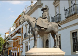 Wir gehen zu Fuß den „Paseo de Cristóbal Colón“, vorbei an der Stierkampfarena „Plaza de toros de la Real Maestranza de Caballería de Sevilla“, vor der ein Reiterstandbild steht, das – hab ich so bisher noch nie gesehen – auch mal eine Frau zeigt, „María de las Mercedes de Borbón y Orleans“, die Mutter des ehemaligen spanischen Königs Juan Carlos. Ihr Standbild steht wohl hier, weil sie angeblich ein großer Stierkampf-Fan gewesen sein soll.