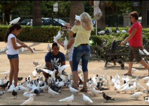 Während man in Schwaben Greifvögel zur Vergrämung von Stadttauben einsetzt, sind die „Stein“-Adler von Sevilla sind dazu aber wohl nicht in der Lage, und so fallen täglich Hunderte – oder gar Tausende (?) – Tauben über Besucher her, die das auch noch toll finden.