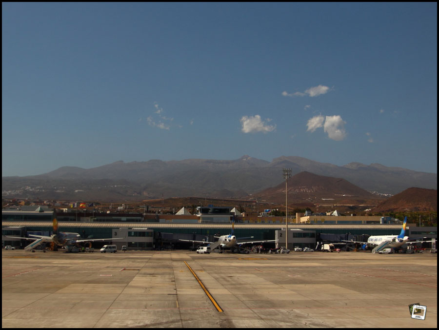 Jetzt sehe ich ihn doch noch, den Teide, und auf der anderen Seite den Montaña Roja, wenn auch nicht vom Flieger sondern vom Rollfeld aus.