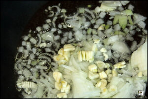 Da mir die käufliche Salsa erstens zu teuer ist und man sie in unseren Läden häufig gar nicht bekommt, mache ich sie selber. Dazu werden Zwiebeln und Knoblauchzehen klein gewürfelt und in etwas Sonnenblumenöl angeschwitzt.