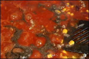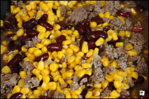 Zuerst werden die klein geschnittenen Zwiebeln in etwas Sonnenblumenöl glasig gedünstet, dann kommen das Hackfleisch, die Kidney-Bohnen …