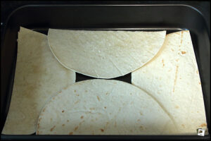 Backofen auf 200°C bis 250°C vorheizen, Wraps so zuschneiden, dass sie gut in eine Auflaufform passen.