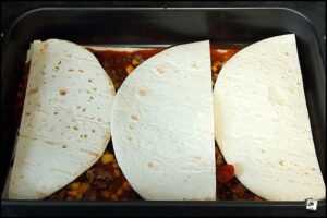 Füllung, Einlage oder wie auch immer du die Masse nennst, auf die erste Schicht Wraps gießen. Das macht man so lange, bis Wraps und Füllung aufgebraucht sind. Die oberste Schicht besteht bei mir dann aus Wraps.