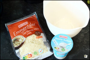 Darauf kommt nun die Käse-Sauerrahm-Gratin-Schicht. Diese besteht aus geriebenem Emmentaler, saurer Sahne und etwas Milch (die Milch macht die Gratin-Schicht fluffiger) und wird mit einem Schneebesen in einer Schüssel angerührt …
