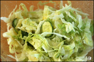 Mein Dressing besteht immer aus Sonnenblumenöl, Essig, etwas Zucker, Senf und Zitronensaft. Eisbergsalat wird in feine Streifen und die Gurke in dünne Scheiben geschnitten. Kurz mit dem Dressing vermischen und fertig.