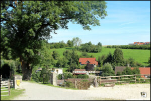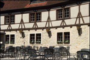 Bis zum Haupteingang geht es am Turnierplatz und an einer mächtigen 200 Jahre alten Esche vorbei ein bisschen runter. Nach dem Eingang kommen wir in den Burghof, der heute bewirtschaftet, momentan aber noch total leer ist.