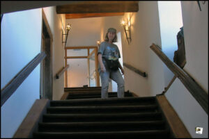 Wir gehen links die Treppen hoch in den Bereich, der in der stauferschen Zeit (Mitte 12. bis Mitte 13. Jahrhundert) das Hauptgebäude beherbergte. Die Stufen knarzen und wir müssen uns jeden Schritt genau überlegen, bevor wir das Gewicht auf den andern Fuß verlagern.