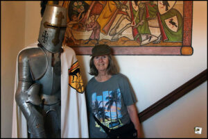 Im Ausstellungssaal treffen wir dann auch Roswitha Walter. Mit ihr hatte Susanne – vor unserem Besuch – einen kurzen, sehr herzlichen E-Mail-Kontakt. Susanne, die Texte immer sehr genau liest, hat in der Ankündigung des „Katzentages auf Burg Katzenstein“ nämlich bemerkt, dass die Öffnungstage einfach nur von 2024 kopiert und nicht auf 2025 angepasst waren. Da wäre viele Besucher wohl vor verschlossener Tür gestanden. So konnte die Burgverwaltung das auf ihrer Homepage noch rechtzeitig korrigieren. Zum Dank hat ihr Frau Walter damals „eine Tasse Kaffee“ versprochen, wenn sie dann auf die Ausstellung käme.