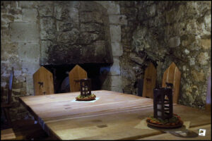 Begonnen hat der Rundgang damals für uns – wie auch für die Gruppe heute – in der kühlen Brunnenstube unter dem Hauptgebäude. Zwei mächtige romanische Tonnengewölbe spannen sich nebeneinander über uns, getragen von drei steinernen Bögen. Hier unten ist es konstant 14 bis 18 °C – ideal für ein Rittermahl in historischem Ambiente.