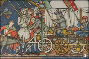 Es zeigte eine mittelalterliche Darstellung mit Rittern, einem Wagen und einem Esel. Stilistisch entspricht das Bild stark der Art von Miniaturen aus mittelalterlichen Handschriften, wie der Maciejowski-Bibel, aber mit der etwas glatteren und moderneren Ausführung, die man in Kopien oder Interpretationen aus späteren Jahrhunderten sehen kann. Wer für das Werk in Burg Katzenstein tatsächlich verantwortlich ist und wann es gemalt wurde, weiß ich bis heute nicht.